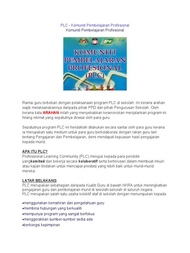 GARIS PANDUAN PELAKSANAAN PROGRAM ENGLISH PROFESSIONAL LEARNING COMMUNITY E-PLC 2019 SEKOLAH-SEKOLAH NEGERI KEDAH PENTING. PLC di sekolah untuk Surat siaran pelaksanaan PLC kepada semua sekolah Men Rend memantapkan Negeri Perak telah dikeluarkan pada 912015 rujukan. Sukacita dimaklumkan bahawa Perjumpaan PLC Panitia Bahasa Malaysia diadakan pada ketetapan seperti berikut.