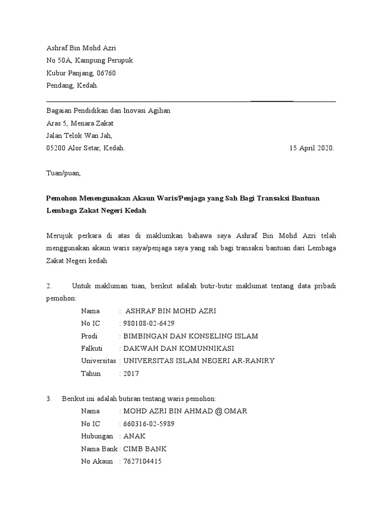 Surat Kepada Lembaga Zakat Kedah Pdf